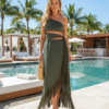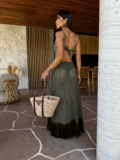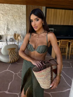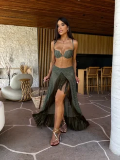 Conjunto de biquíni verde militar com saia de tela crochet no mesmo tom, barrado de franjas artesanais. O top de biquíni é confeccionado em malha trilobal com alças ajustáveis, bojo e aro para melhor sustentação.