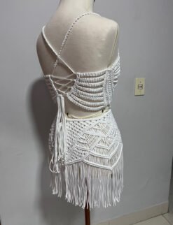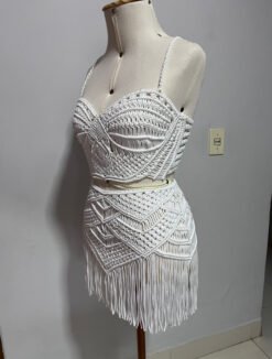 O conjunto é composto por top estruturado, que realça o busto com delicadeza, e saia com franjas, que cria movimento fluido e um visual impactante a cada passo. Um verdadeiro statement para quem busca sofisticação com alma boho chic.