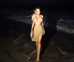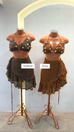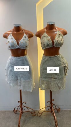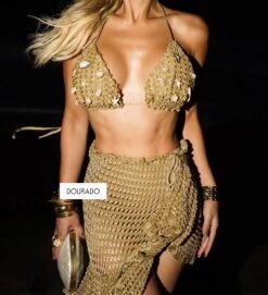Produzido em Tricot de Fios de Seda, com toque macio e caimento perfeito, o top traz um bojo estruturado com aplicações naturais de conchas, inspirado nos elementos do mar e no estilo boho-glam das praias de Ibiza. Já a saia com babado e amarração lateral completa o visual com movimento e feminilidade.