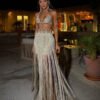 O top possui caimento drapeado que valoriza o colo com suavidade, enquanto a saia com fenda profunda e franjas longas que alongam a silhueta e cria um movimento incrível a cada passo. Combine com sandálias de tiras douradas, rasteiras minimalistas ou saltos finos para elevar ainda mais o visual. Acrescente um chapéu Panamá ou acessórios em metal para um toque ainda mais glam.