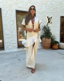 Conjunto de biquíni confeccionado em malha trilobal na cor champagne, poncho e amarração de franjas.