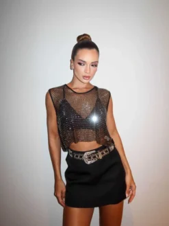 O Cropped Shine é a peça perfeita para quem quer brilhar com atitude e sofisticação. Com um design moderno em trama vazada e aplicação de brilho intenso, ele transforma qualquer look básico em uma produção impactante e fashionista.