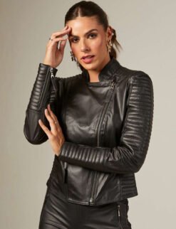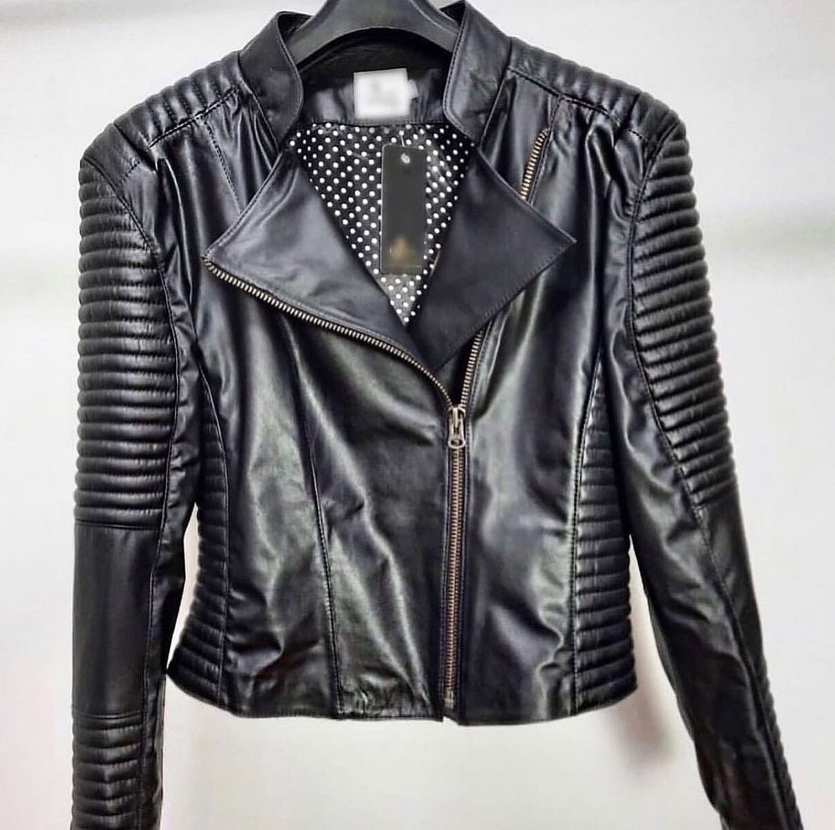 Jaqueta de couro metalada no ombro e na manga, gola padre e zíper diagonal na frente.