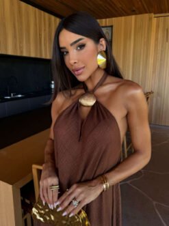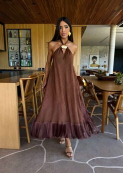 Vestido midi alongado confeccionado em tecido creponado na cor marrom, com um design elegante.