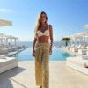 A peça apresenta uma fenda profunda no busto que adiciona um toque de sensualidade, complementada por um sofisticado adorno dourado no pescoço, que funciona como detalhe central. O fechamento na parte das costas é por amarração. Possui cava profunda nas laterais.