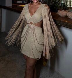 O design apresenta decote profundo, recorte estratégico na cintura com detalhe de argola central e aplicações em correntes douradas que caem suavemente sobre a saia, criando um efeito luxuoso e poderoso. As mangas em franjas longas trazem movimento e impacto visual, tornando a peça simplesmente inesquecível.