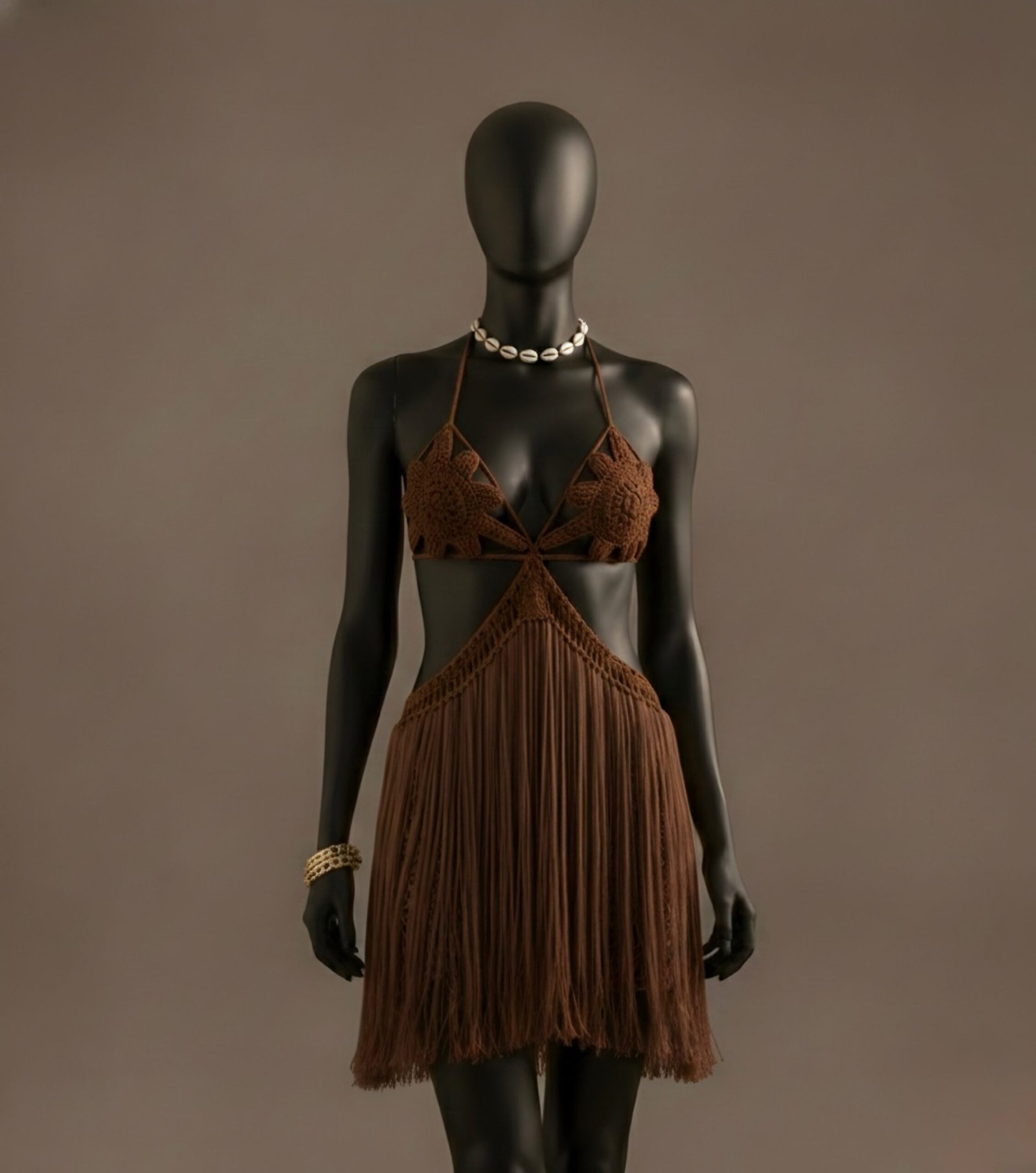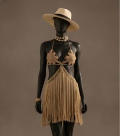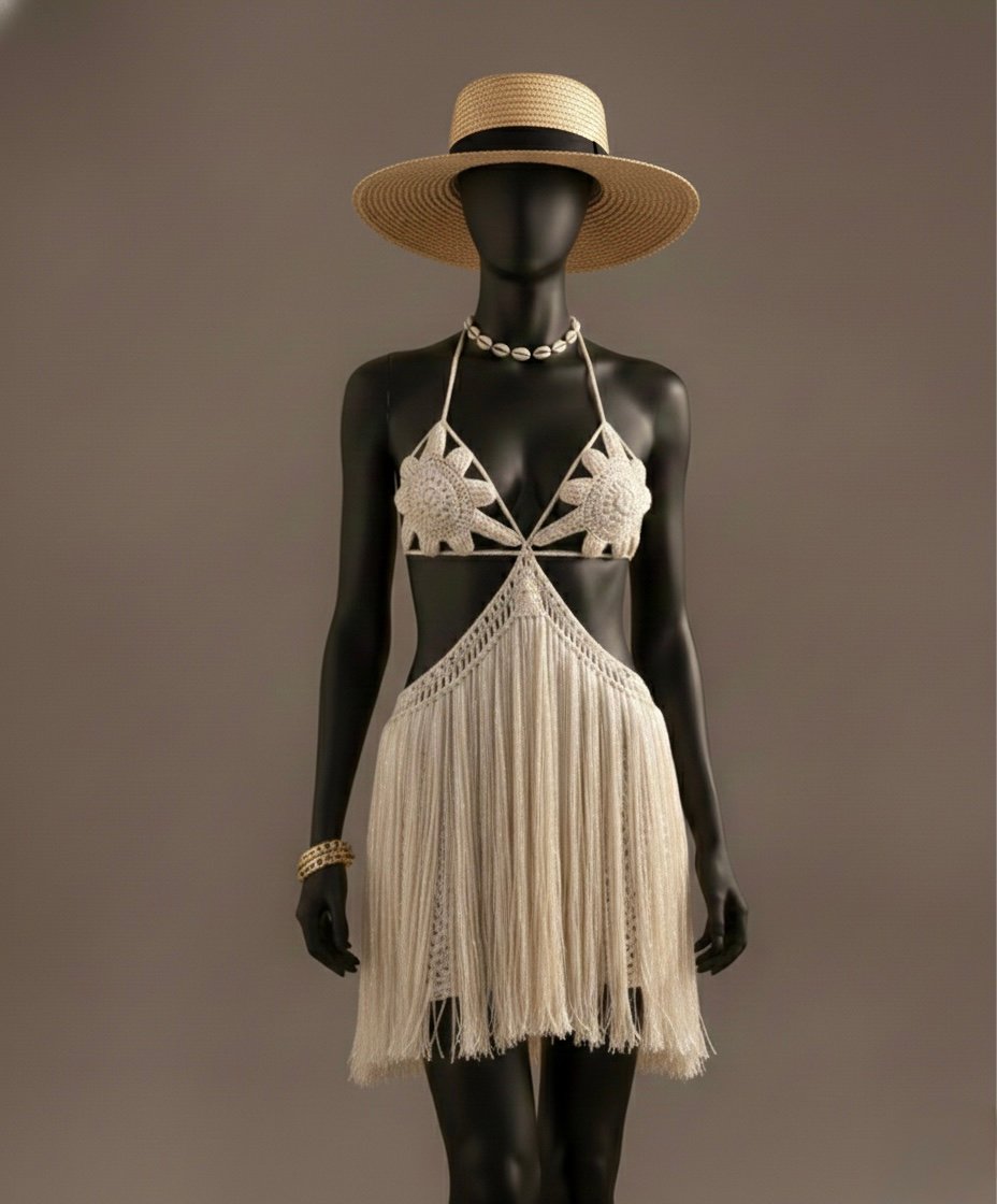 Confeccionado em crochê manual em fio de seda, com delicadas aplicações florais no busto e uma saia de franjas longas que dança a cada passo, este vestido é pura expressão de charme boho chic.