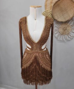 O Vestido Athenas é uma verdadeira obra de arte em crochet feito à mão com fio de seda, trazendo leveza, movimento e um brilho sofisticado na medida certa. Seu design valoriza a silhueta com recortes estratégicos na cintura, decote profundo e franjas longas que acompanham cada passo, criando um efeito único de elegância e sensualidade.