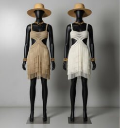 Com recortes estratégicos nas laterais, o modelo valoriza a silhueta de forma impecável, criando um efeito de cintura mais marcada e curvas realçadas. A saia com franjas longas traz movimento e leveza, criando um visual irresistível e cheio de personalidade.