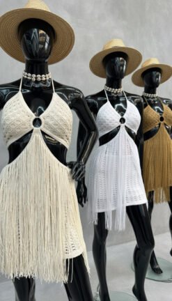 O vestido Floripa é aquela peça que transforma qualquer saída de praia em um look de capa de revista. Confeccionado em fio premium Rayon, ele tem caimento leve, toque macio e um brilho delicado que realça o bronze. O design traz top em crochê com recorte central, argola decorativa e franjas longas e fluídas que dão movimento a cada passo — perfeito para quem ama elegância com bossa.