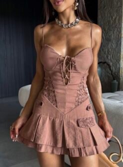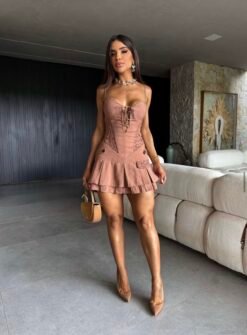 Vestido de alfaiataria estruturado com barbatanas ao corpo em estilo corset, alcinhas finas reguláveis e bojo embutido em meia-taça. Possui fechamento frontal em lace-up e fechamento nas costas por zíper invisível.