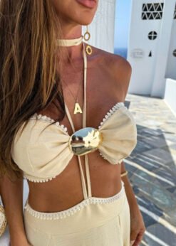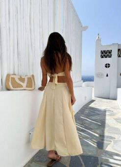 A saia ampla, adornada com jabôs, proporciona volume e movimento, enquanto o amarril no cós da saia permite que seja ajustado ao pescoço em choker, criando uma silhueta criativa.
